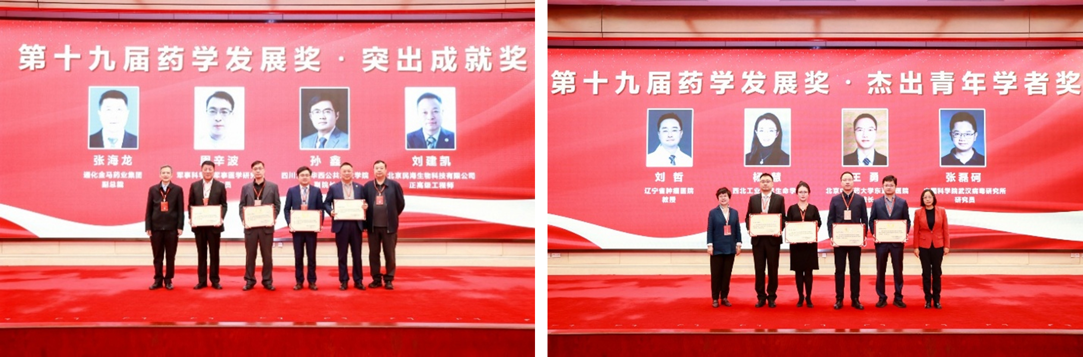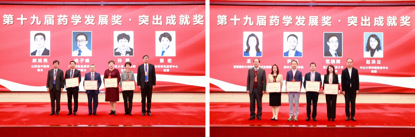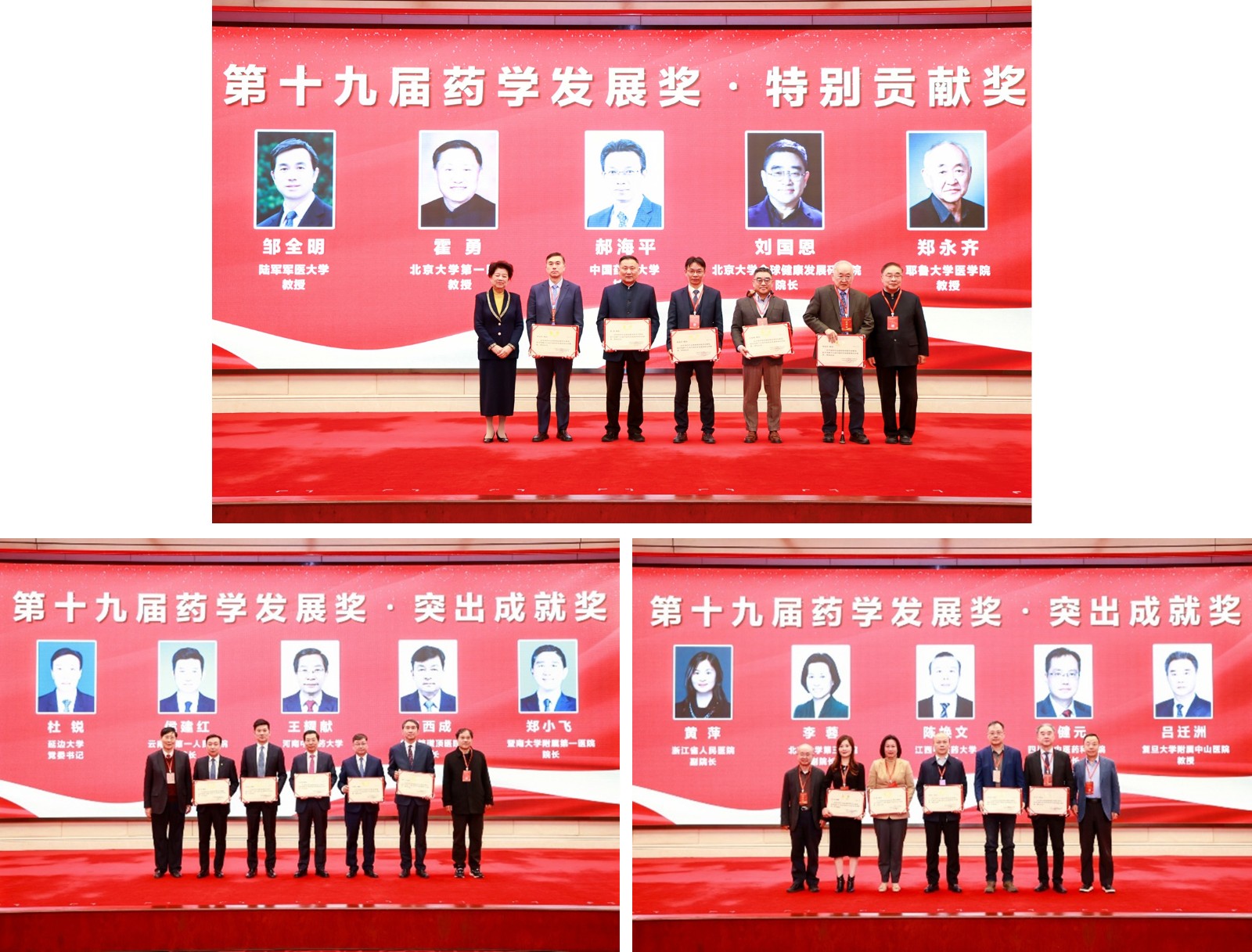 之后,对在创新药物研究和临床药物应用研究等方面作出重大或突出成就、创造性地解决关键科学技术问题的获奖专家,依次颁发了特别贡献奖、突出成就奖、杰出青年学者奖。